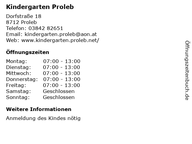 | Öffnungszeiten Kindergarten Proleb in Proleb anzeigen | |