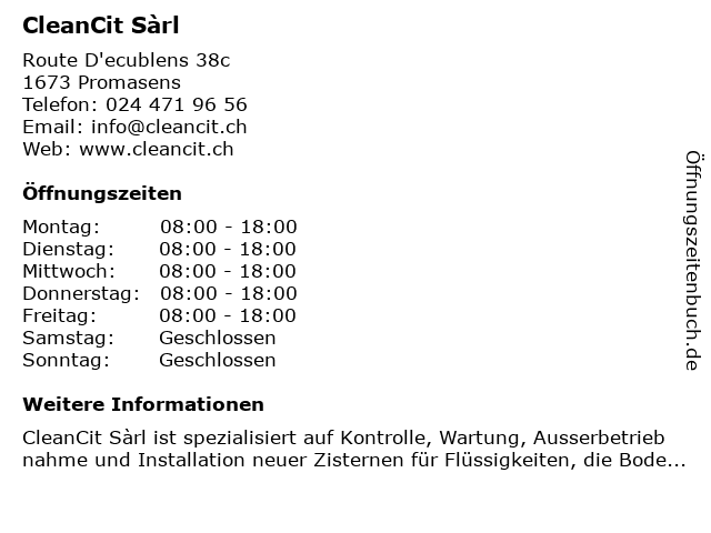 | Öffnungszeiten CleanCit Sàrl in Promasens anzeigen | |