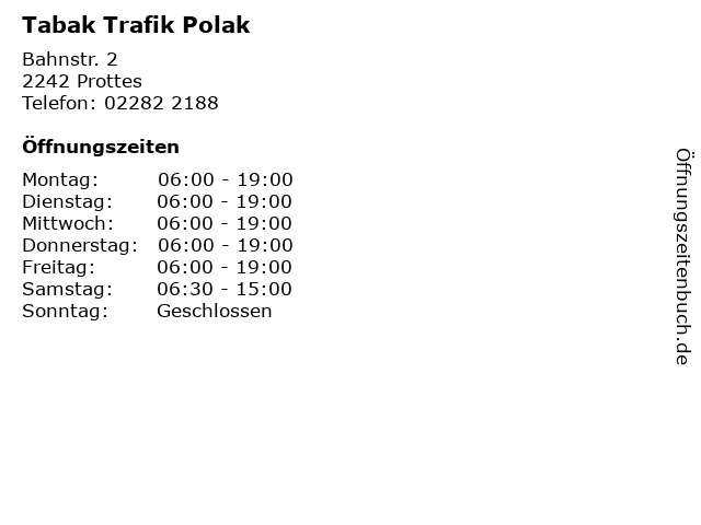 | Öffnungszeiten Tabak Trafik Polak in Prottes anzeigen | |