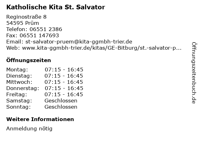 | Öffnungszeiten Katholische Kita St. Salvator in Prüm anzeigen | |