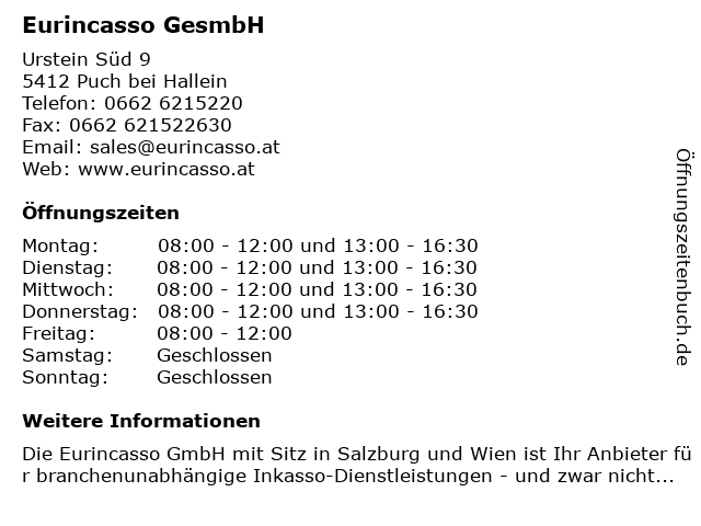 | Öffnungszeiten Eurincasso GesmbH in Puch bei Hallein anzeigen | |