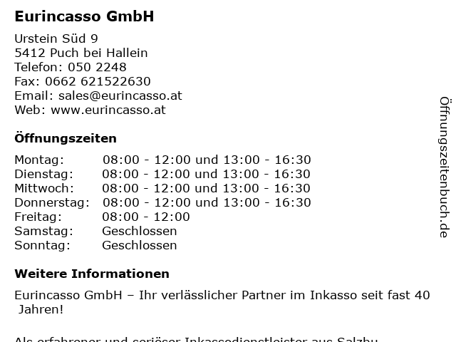 | Öffnungszeiten Eurincasso GmbH in Puch bei Hallein anzeigen | |