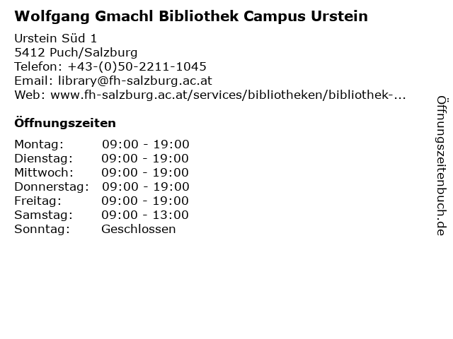 1 AK Salzburg - Fachhochschule Salzburg - Campus Urstein (Entfernung: 0,08 km) Urstein Süd 1, 5412 Puch/Salzburg 6 |