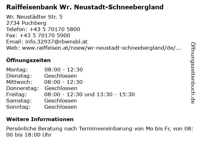 3 Raiffeisenbank Wr. Neustadt-Schneebergland (Entfernung: 10,66 km) Willendorferstrasse 295, 2732 Würflach 5 Raiffeisenbank Wr. Neustadt-Schneebergland (Entfernung: 12,65 km) Hauptstraße 16, 2724 Hohe Wand-Stollhof 6 |