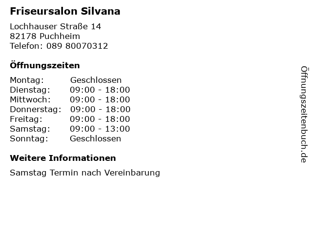 | Öffnungszeiten Friseursalon Silvana in Puchheim anzeigen | |