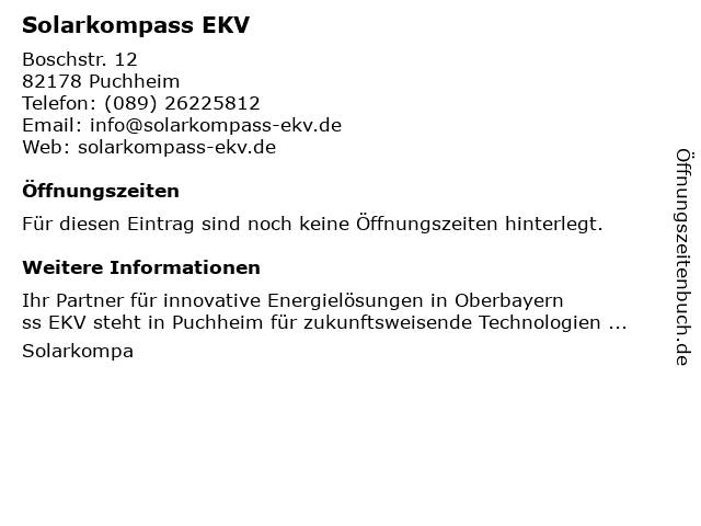 | Öffnungszeiten Solarkompass EKV in Puchheim anzeigen | |