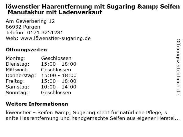 Branchen & Suchbegriffe zu löwenstier Haarentfernung mit Sugaring & Seifen Manufaktur mit Ladenverkauf:begleitservice, haarentfernung, kosmetikgeschäft, ladenverkauf, löwenstier, manufaktur, mit, seifen, sugaring |