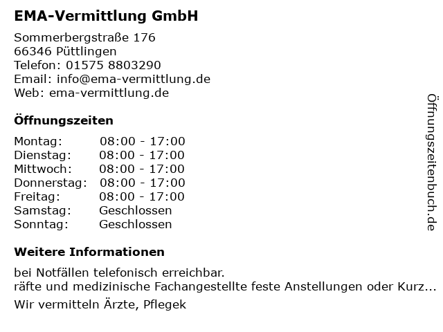| Öffnungszeiten EMA-Vermittlung GmbH in Püttlingen anzeigen | |