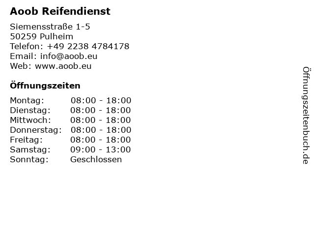 | Öffnungszeiten Aoob Reifendienst in Pulheim anzeigen | |