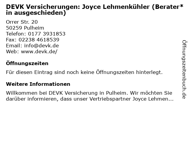 | DEVK Versicherungen: Joyce Lehmenkühler (Berater*in ausgeschieden) anrufen | |