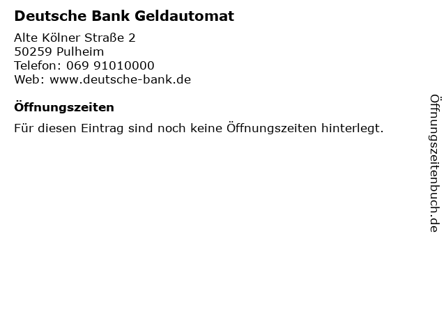 | Öffnungszeiten Deutsche Bank Geldautomat in Pulheim anzeigen | |