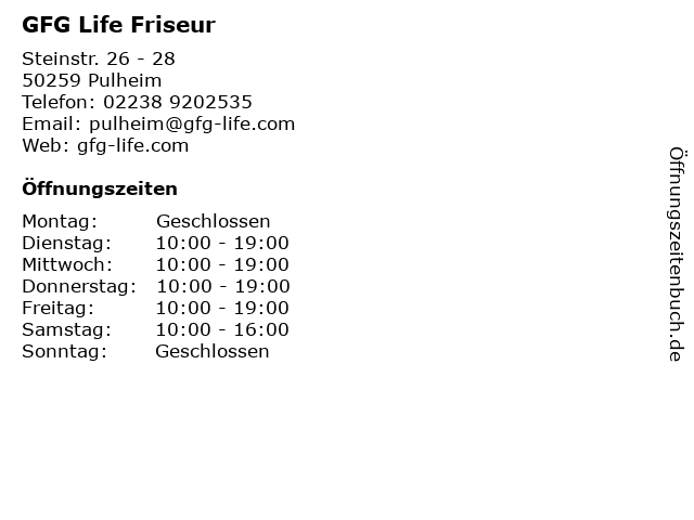 | Öffnungszeiten GFG Life Friseur in Pulheim anzeigen | |