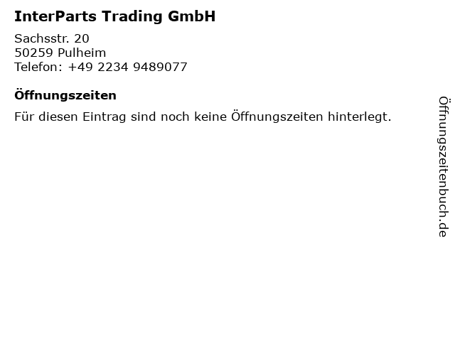 | Öffnungszeiten InterParts Trading GmbH in Pulheim anzeigen | |