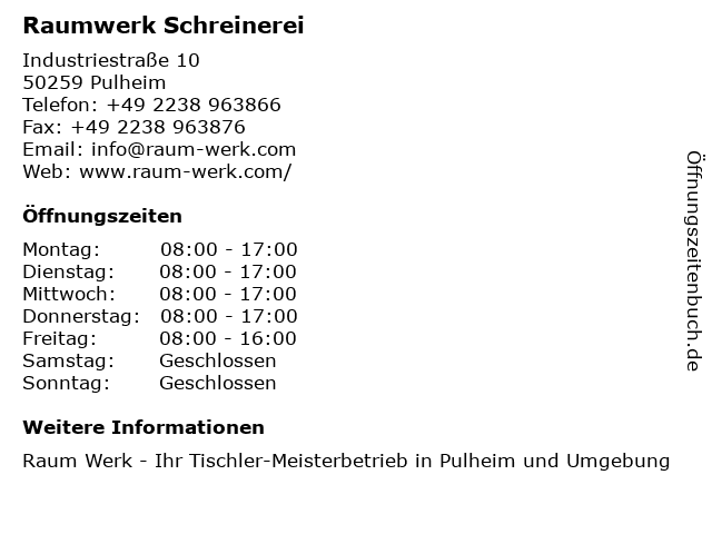 | Öffnungszeiten Raumwerk Schreinerei in Pulheim anzeigen | |