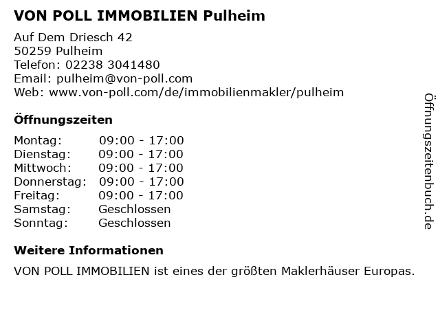 | Öffnungszeiten VON POLL IMMOBILIEN Pulheim in Pulheim anzeigen | |
