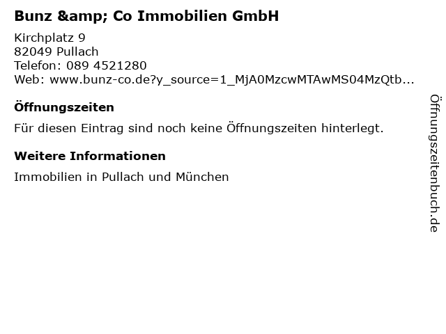 | Öffnungszeiten Bunz & Co Immobilien GmbH in Pullach anzeigen | |