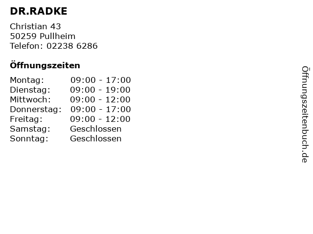 Öffnungszeiten DR.RADKE in Pullheim anzeigen | |