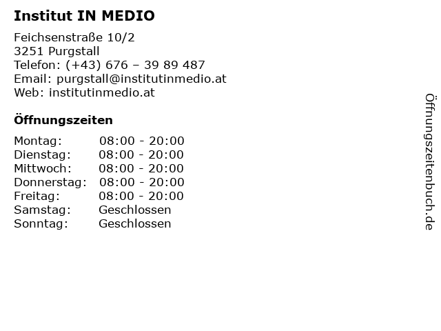 | Öffnungszeiten Institut IN MEDIO in Purgstall anzeigen | |