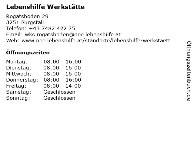 | Öffnungszeiten Lebenshilfe Werkstätte in Purgstall anzeigen | |