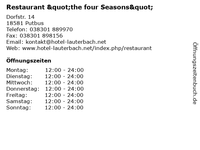 | Öffnungszeiten Restaurant "the four Seasons" in Putbus anzeigen | |
