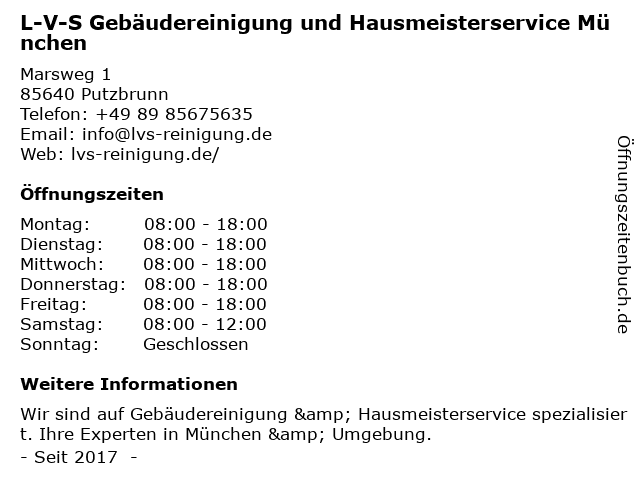 1 L-V-S Gebäudereinigung und Hausmeisterservice München (Entfernung: 2,23 km) Marsweg 1, 85640 Putzbrunn 3 Gerhard Holzhauser Ing.Büro für Versorgungstechnik, Hausmeisterservice (Entfernung: 2,38 km) Dresselstr. 10 A, 81827 München 6 |
