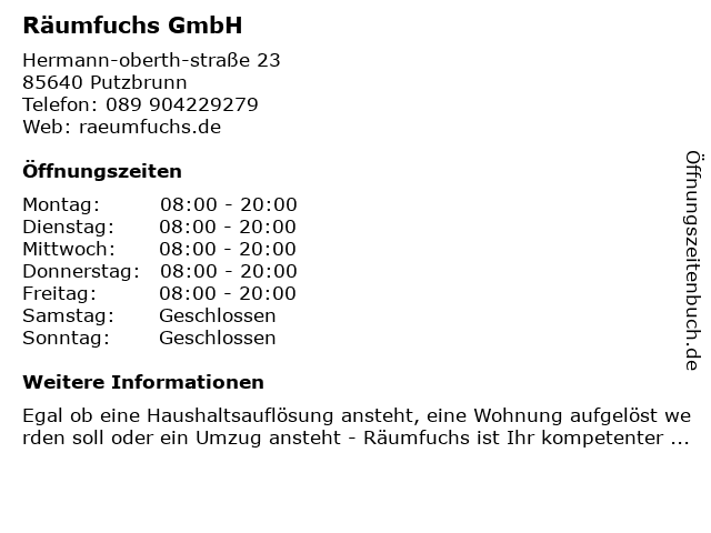 | Öffnungszeiten Räumfuchs GmbH in Putzbrunn anzeigen | |