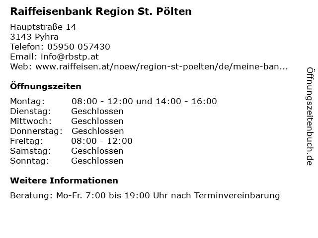 Branchen & Suchbegriffe zu Raiffeisenbank Region St. Pölten:bank, bankstelle, geld, konto, kredit, pyhra, pölten, raiffeisenbank, region, vermögen, vorsorge |