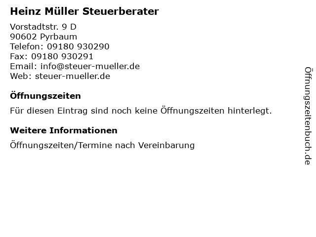 | Öffnungszeiten Heinz Müller Steuerberater in Pyrbaum anzeigen | |