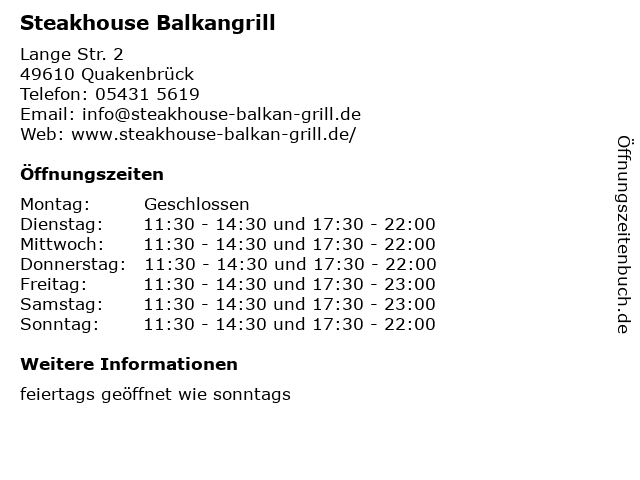 | Öffnungszeiten Steakhouse Balkangrill in Quakenbrück anzeigen | |