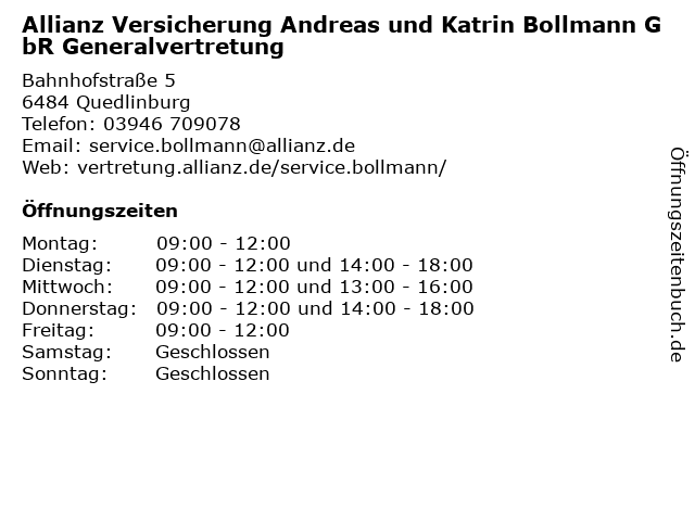 1 Allianz Versicherung Andreas und Katrin Bollmann GbR Generalvertretung (Entfernung: 5,89 km) Breite Straße 2, 06484 Ditfurt 5 Allianz Versicherung Daniel Held Generalvertretung (Entfernung: 1,15 km) Neinstedter Feldweg 2, 06484 Quedlinburg 6 |