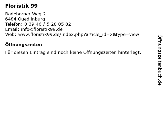 | Öffnungszeiten Floristik 99 in Quedlinburg anzeigen | |