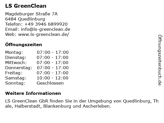 | Öffnungszeiten LS GreenClean in Quedlinburg anzeigen | |