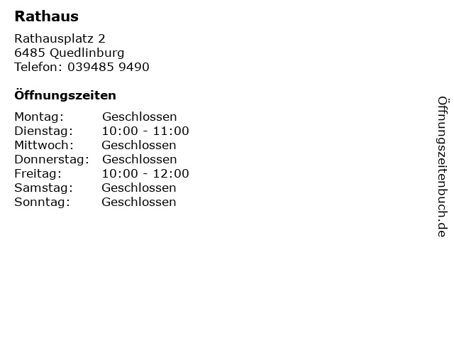 | Öffnungszeiten Rathaus in Quedlinburg anzeigen | |