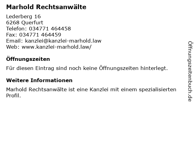 | Öffnungszeiten Marhold Rechtsanwälte in Querfurt anzeigen | |