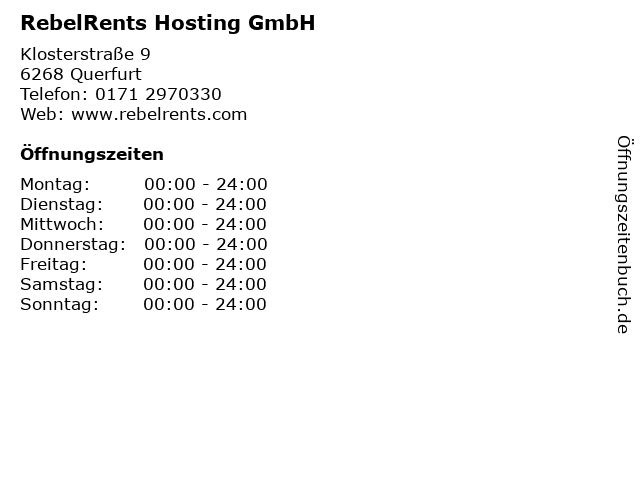 | Öffnungszeiten RebelRents Hosting GmbH in Querfurt anzeigen | |