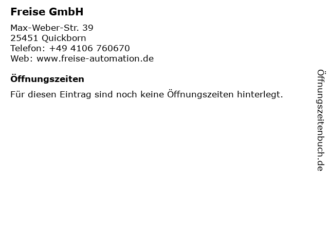 | Öffnungszeiten Freise GmbH in Quickborn anzeigen | |