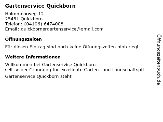 | Öffnungszeiten Gartenservice Quickborn in Quickborn anzeigen | |