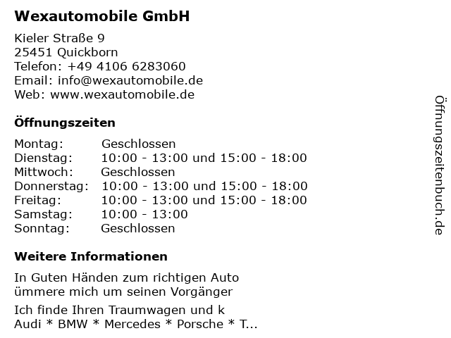 | Öffnungszeiten Wexautomobile GmbH in Quickborn anzeigen | |