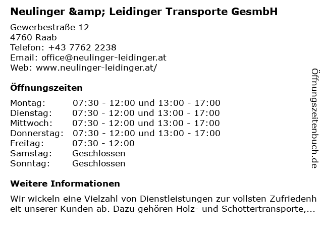 Branchen & Suchbegriffe zu Neulinger & Leidinger Transporte GesmbH:abbrucharbeiten raab, baggerungen raab, containerdienste raab, entsorgung raab, gesmbh, leidinger, neulinger, recycling raab, transport von fertigbeton raab, transporte, transporte raab |