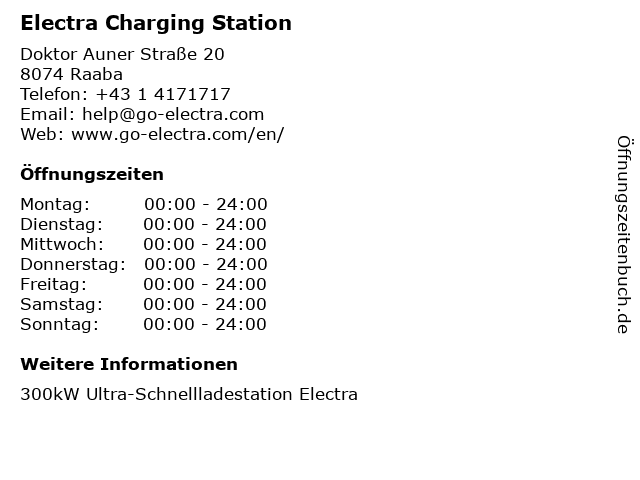 | Öffnungszeiten Electra Charging Station in Raaba anzeigen | |