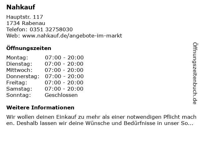 | Öffnungszeiten Nahkauf in Rabenau anzeigen | |