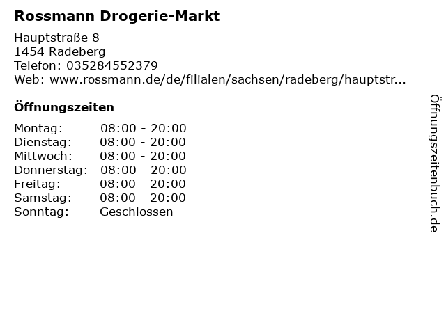 | Öffnungszeiten Rossmann Drogerie-Markt in Radeberg anzeigen | |