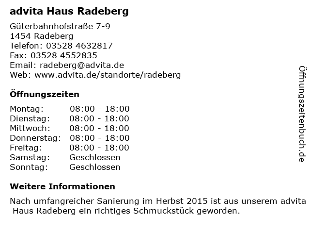 | Öffnungszeiten advita Haus Radeberg in Radeberg anzeigen | |