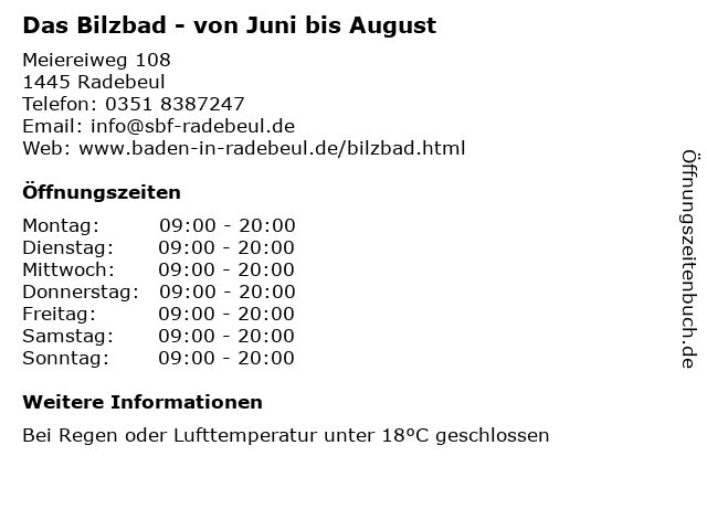 Branchen & Suchbegriffe zu Das Bilzbad - von Juni bis August:18°c, august, august:, bei, bilzbad, bis, freibad, freizeit, juni, lufttemperatur, oder, regen, stadion, telefonnummer, unter, von, öffnungszeit |
