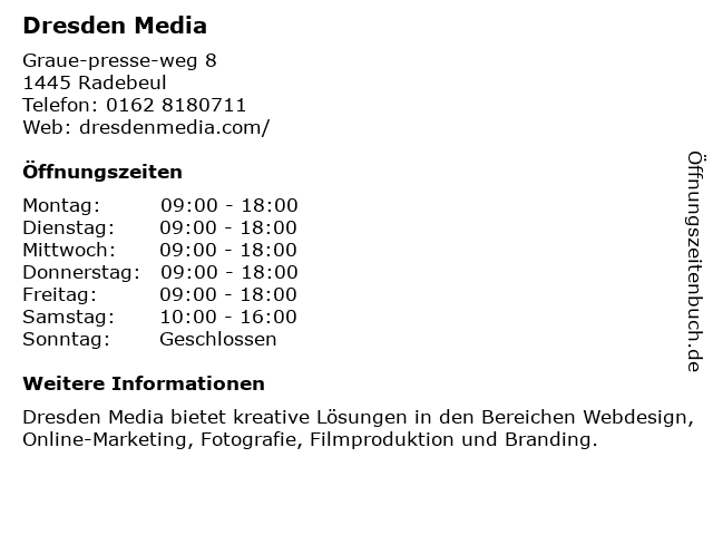 | Öffnungszeiten Dresden Media in Radebeul anzeigen | |