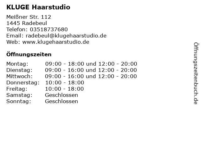 | Öffnungszeiten KLUGE Haarstudio in Radebeul anzeigen | |
