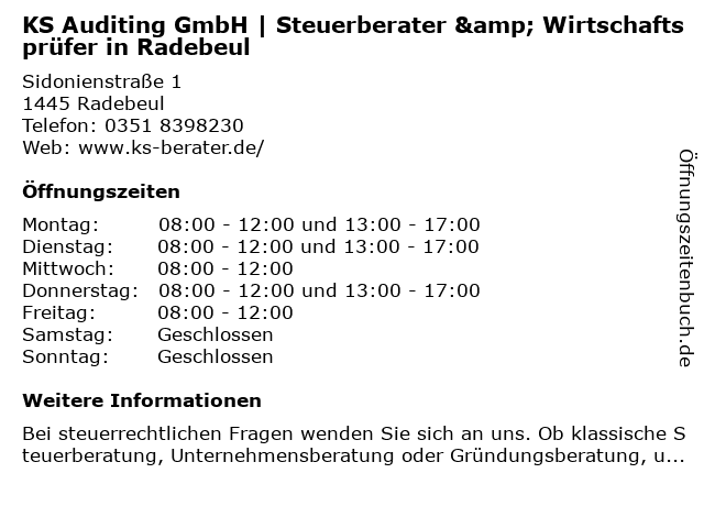 Branchen & Suchbegriffe zu KS Auditing GmbH | Steuerberater & Wirtschaftsprüfer in Radebeul:auditing, ks, schuldeneintreibungsdienste, steuerberater, steuerberatung, wirtschaftsprüfer |
