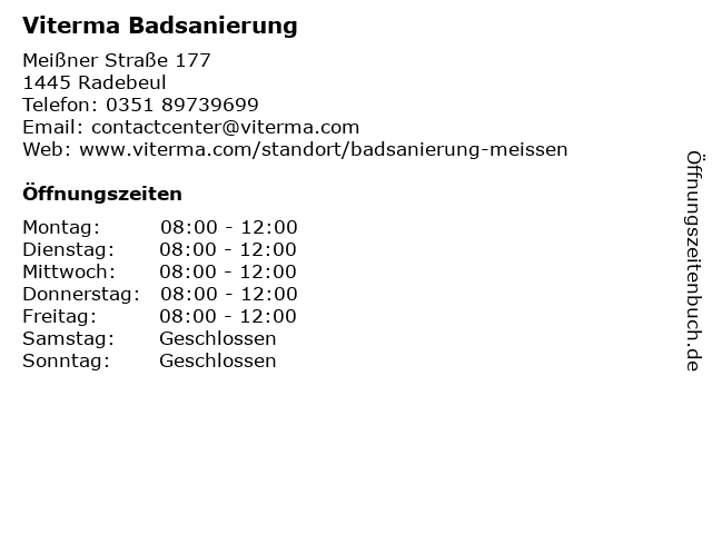 | Öffnungszeiten Viterma Badsanierung in Radebeul anzeigen | |