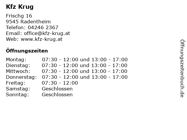 | Öffnungszeiten Kfz Krug in Radentheim anzeigen | |