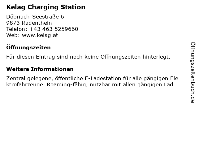 | Öffnungszeiten Kelag Charging Station in Radenthein anzeigen | |